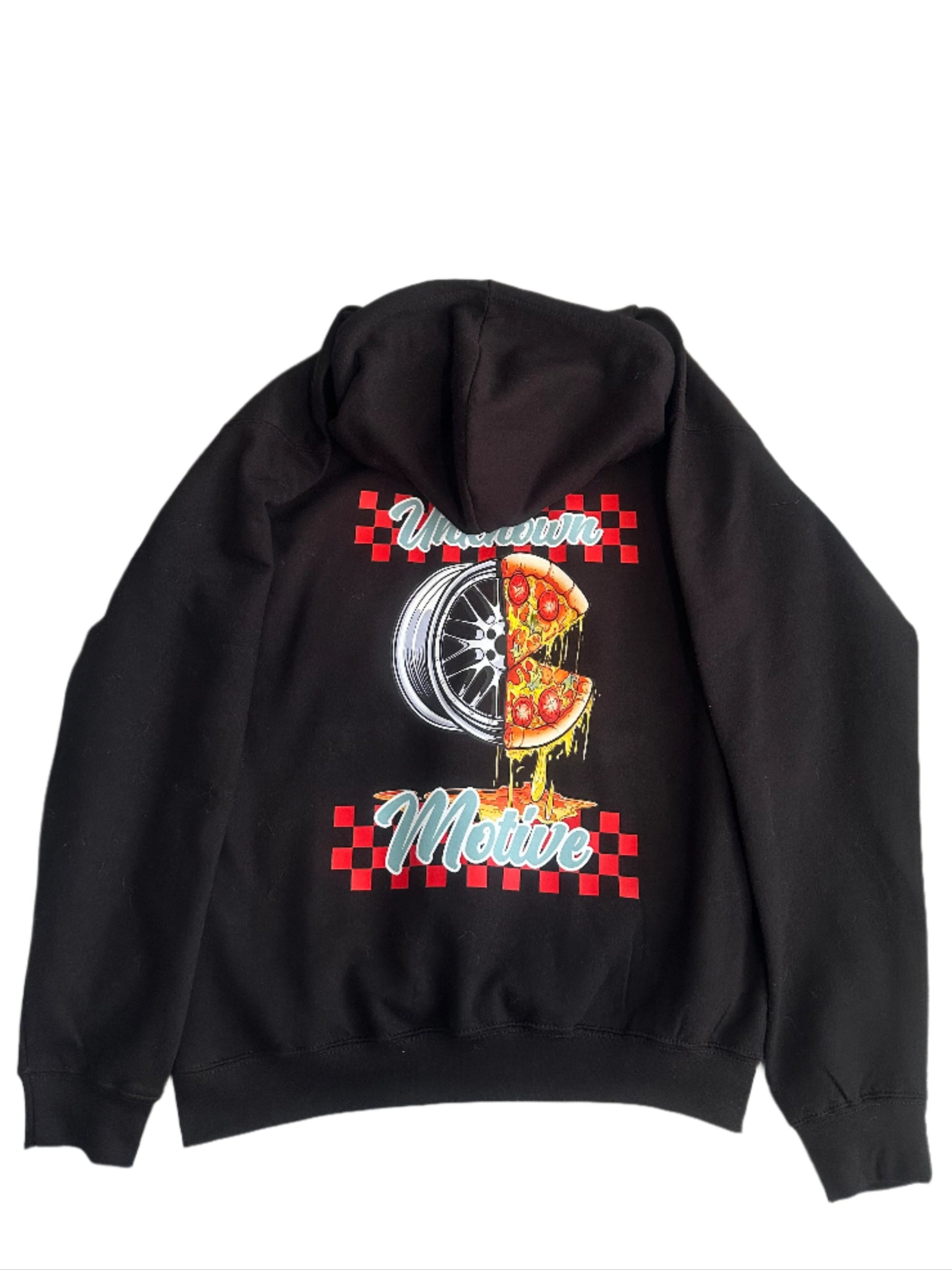 Part of our Deep dish collection, we have this premium quality black hoodie that features half deep dish wheel and half deep dish pizza!. If you love cars and food this is a must have for your wardrobe. Shipped and printed in the uk.